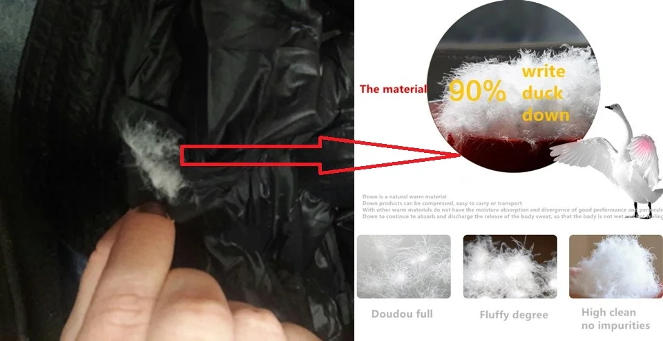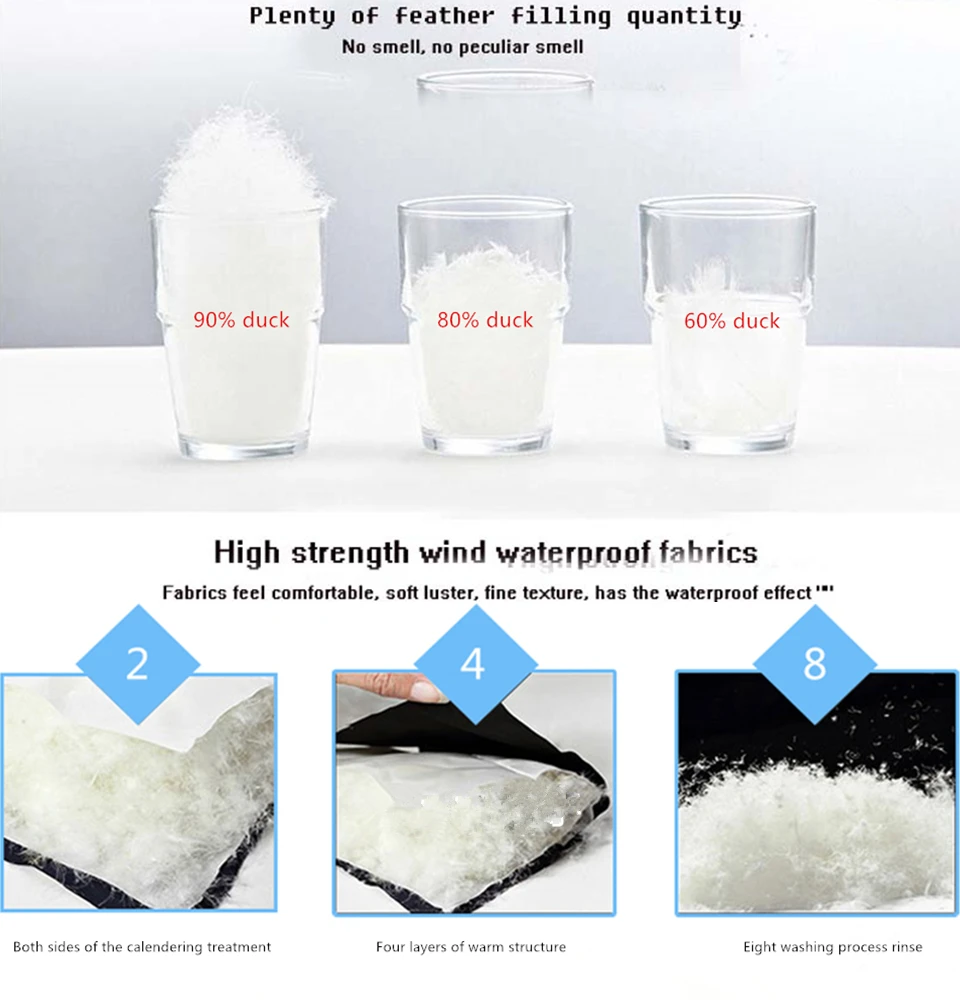 - The filler is usded 90% white duck down ,it is so warm and light so that it is very comfortable when you wear it ,90% of the white duck loftiness and warmth is the highest, it makes it very comfortable to wear.