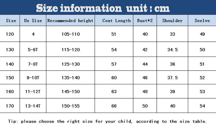 SIZE Length Sleeve Bust Suggest height 8(130) 60cm 51cm 90cm 130cm 10(140) 64cm 54cm 94cm 140cm 12(150) 68cm 57cm 98cm 150cm 14(160) 72cm 60cm 102cm 160cm