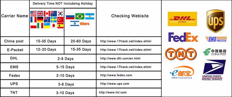 A: The shipping time depends on the way of logistics and the country. And the holiday also can affect the shipping time. So the following logistics time is just for reference.If there is any problem, welcome to contact us.