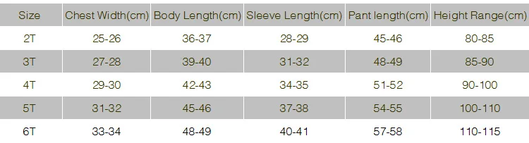 100% Brand New Component:Cotton 1 sets = jacket + pants Age: 2-6years Size: 2T-3T-4T-5T-6T Notes: Please check the Size table before place order ————————————————————- Size Height Range 2T 80-85cm/31.50-33.46〃 3T 85-90cm/33.46-33.46〃 4T 90-100cm/33.46-39.37〃 5T 100-110cm/39.37-43.31〃 6T 110-115cm/43.31-45.28〃 ————————————————————-