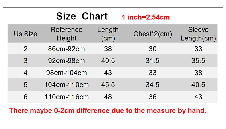 Size Chart Us Size 18 M 24 M 3 T 4 T 5 T Shoulder 23cm 24cm 24.5cm 25cm 26cm Sleeved 31cm 34cm 36cm 37.5cm 39cm Bustline 27*2cm 28*2cm 30*2cm 31*2cm 32*2cm Length 34cm 35cm 37cm 39cm 41cm Suggest Height … Read More
