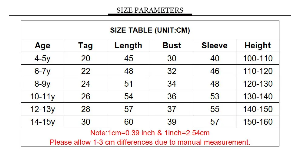 Size Chart Us Size 18 M 24 M 3 T 4 T 5 T Shoulder 23cm 24cm 24.5cm 25cm 26cm Sleeved 31cm 34cm 36cm 37.5cm 39cm Bustline 27*2cm 28*2cm 30*2cm 31*2cm 32*2cm Length 34cm 35cm 37cm 39cm 41cm Suggest Height … Read More