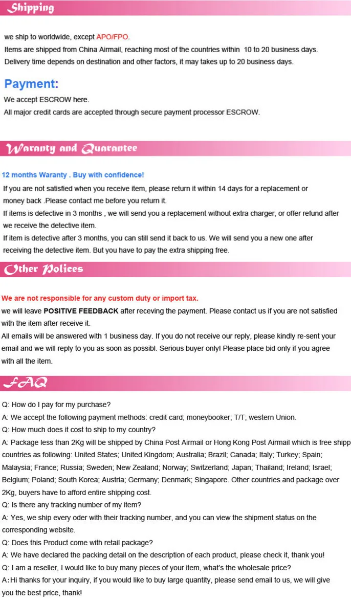 3.When order < $7,we provide free shipping by China Post Ordinary Small Packet Plus.(without tracking infomation;delivery time 20-45 days)