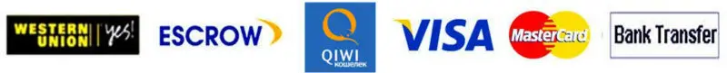 - Visa, MasterCard, QIWI, Western Union and bank transfer are accepted through secure payment processor Escrow on Aliexpress.