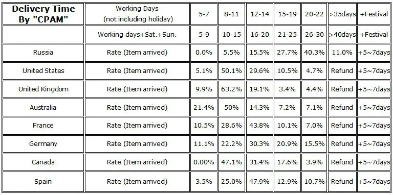 International package takes about 15-20 days to ship to destination; By post office past shipping statistic report, here below is the arrival lead time performance table for some countries, which is for buyer reference only.