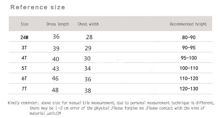 Size Chart,it has 1-2 cm error Product Size Height Length Bust Age 3T 90cm 39cm 56cm 2 years 4T 100cm 42cm 60cm 2-3 years 5T 110cm 45cm 64cm 3-4 years 6T 120cm 48cm 68cm 5-6 years 7T 130cm 50cm 72cm … Read More