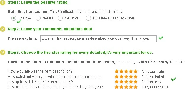 We left positive feedback for you after receiving payment. Your feedback is very important for us, positive feedback and 5 Score DSR is highly appreciated.