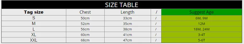 Size Chart (Only for references) Size Length(cm) Chest/2 (cm) 90/2T 39 28 100/3T 42 30 110/4T 45 32 120/6 47 34 130/8 50 36