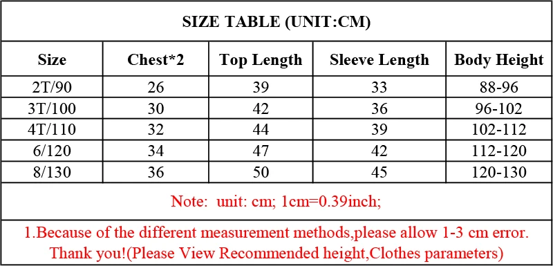 Size Clothing Length(cm) Chest(cm) Sleeve(cm) Height 90/2T 39 58 33 95 100/3T 42 62 36 100 110/4T 45 66 39 108 120/6 47 70 42 117 130/8 50 73 44 125