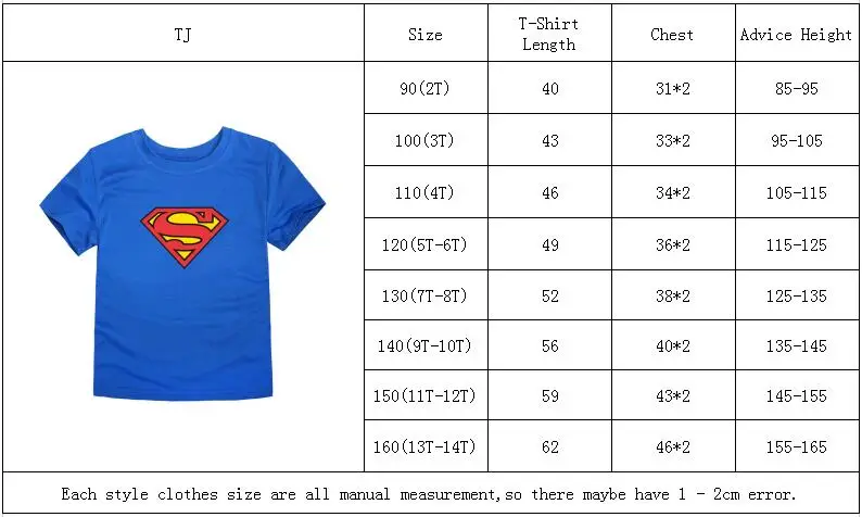 Size Chart (Only for references) Size Length(cm) Chest/2 (cm) 90/2T 39 28 100/3T 42 30 110/4T 45 32 120/6 47 34 130/8 50 36