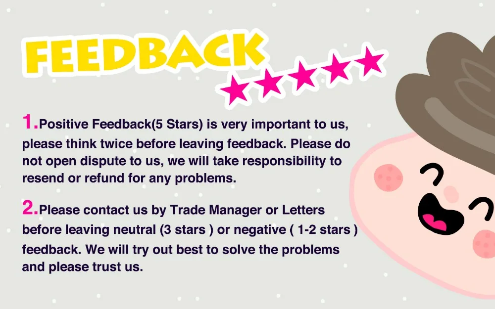 We are an online store, every feedback is very important to us. We appreciate your positive feedback after confirmed your order. We aim for star service and want you to be happy. If you are not satisfy with our product or service, please contact us firstly& nbsp;before open a dispute. We believe that all of customers are kind hearted, and any issue will be solved under good communication. Trust us!