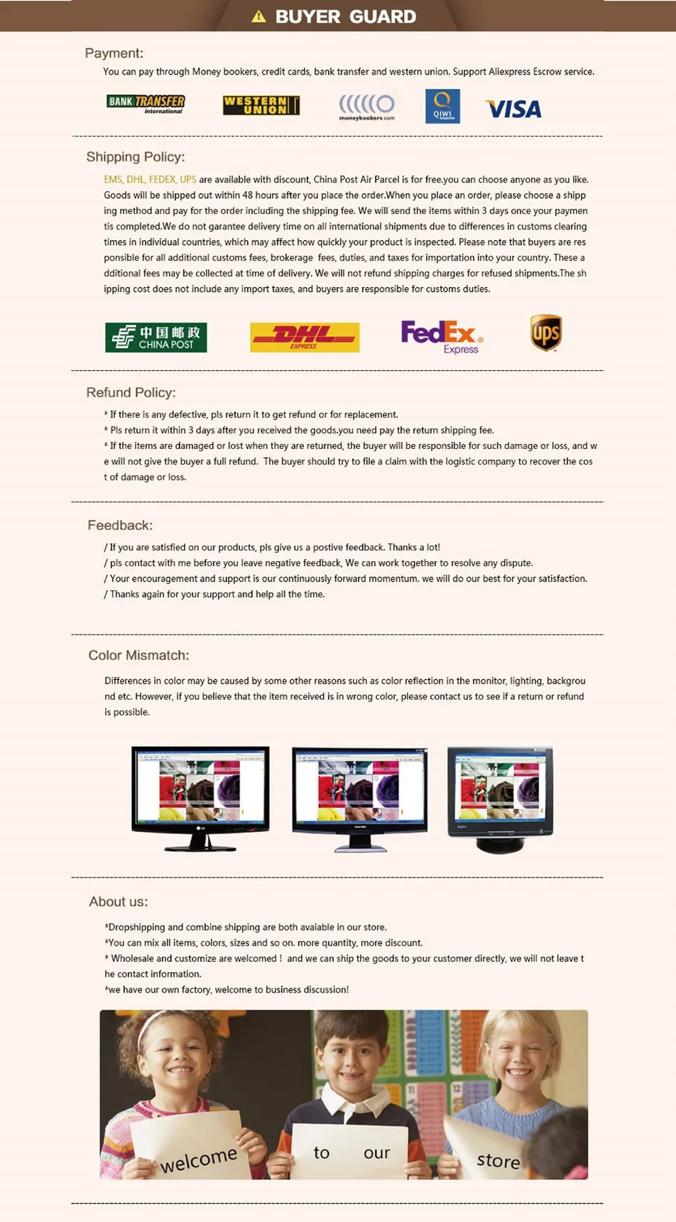 Dear Customer: 1)Please be sure that we’ll ship the goods out within 1-3 days,although we can’t be on line all the time due to the time zone. 2)Try to avoid probable taxes,packages mark with ‘gift’ and set the value as … Read More