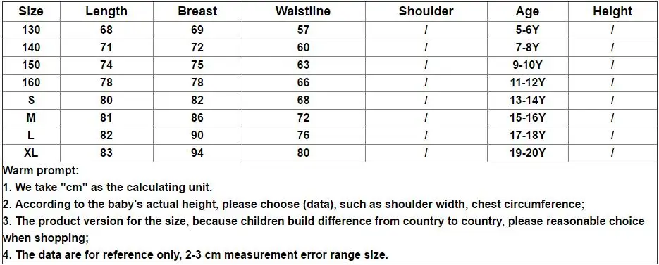 | dimensioni | 130=5-6 140=7-8T 150=(9-10T) 160(11-12T) S=13-14T M=15-16 L=17-18T XL=19-20T (è possibile scegliere il formato che cosa volete) | |||