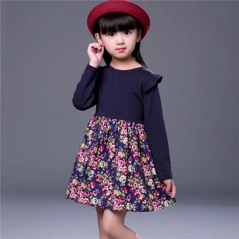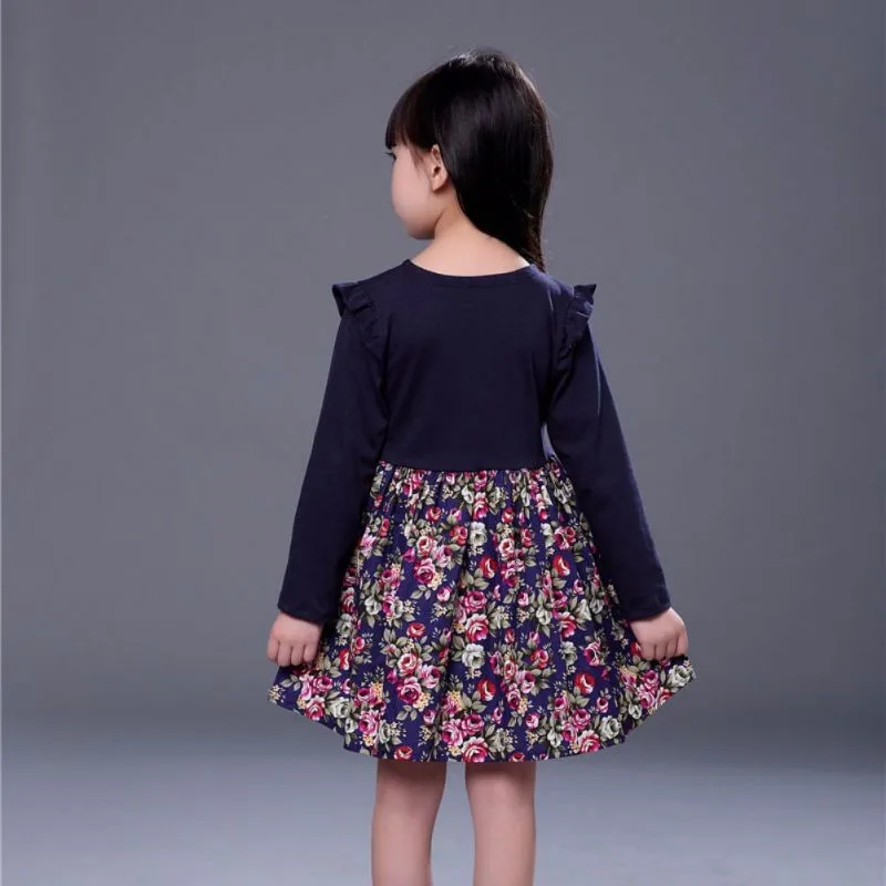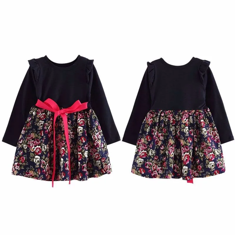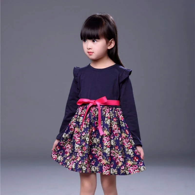 Fashion Children Girls Long Sleeve with Sashes Cute Kids Flower Pattern Print Dress