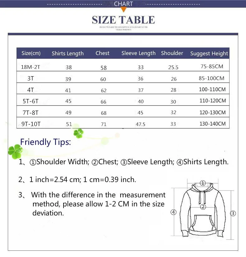 material: 100% cotton size Length bust*2 sleeve long age S 35 29 31 18M M 37 31 33 2T L 39 33 35 3T XL 41 35 37 4T 1. If you are satisfied with our products and services, please … Read More