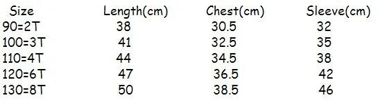 SIZE TABLE (UNIT:CM) SIZE Length Chest*2 Sleeve Suggest Heigth 90=18M 33 28 28 75-85 100=2T 36 29 30 85-95 110=3T 37 31 33 95-105 120=4T 39 32 36 105-115 130=5T 44 33 39 115-125 Note:1cm=0.39 inch & 1inch=2.54cm Please allow … Read More