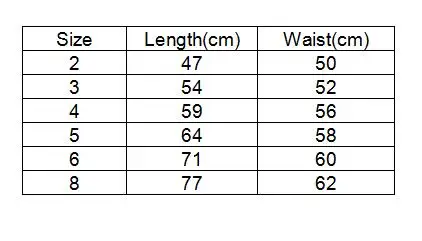 8 T / 8: Length is 77 cm, the waist is 62 cm, it is fit for 130-140 cm in height.