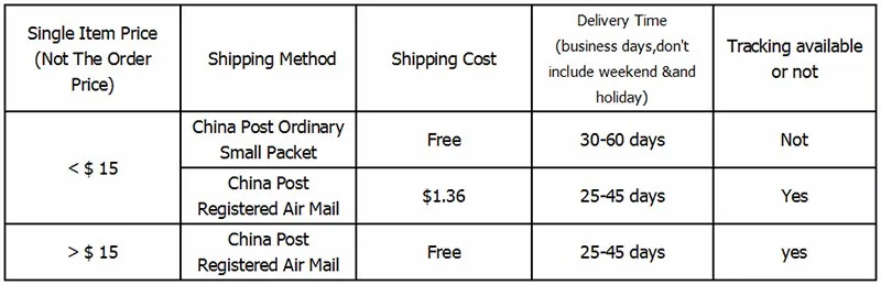 1.Items will be sent out by China Post within 7 days once your payment is cleared.We can’t send goods on weekend and Chinese holidays.