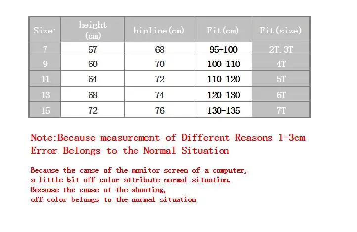 Suitable ages Size Length Waist*2(elasticity) Hip For height 2T 100 56 21 64 80-90cm 3T 110 59 21 67 90-100cm 4T 120 65 21 70 100-110cm 5T 6T 130 70 22 72 110-120cm 7T 8T 140 74 22 76 120-130cm … Read More