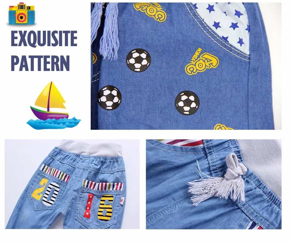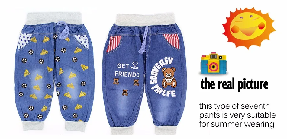 Jiuhehall 2016 New Fashion Kids Jeans Elastic Waist Straight Cartoon Jeans Denim Seventh Pants Retail Jeans For Kids 2-5 Y WB141