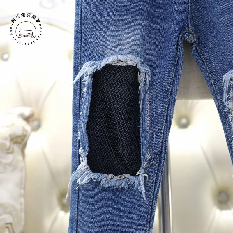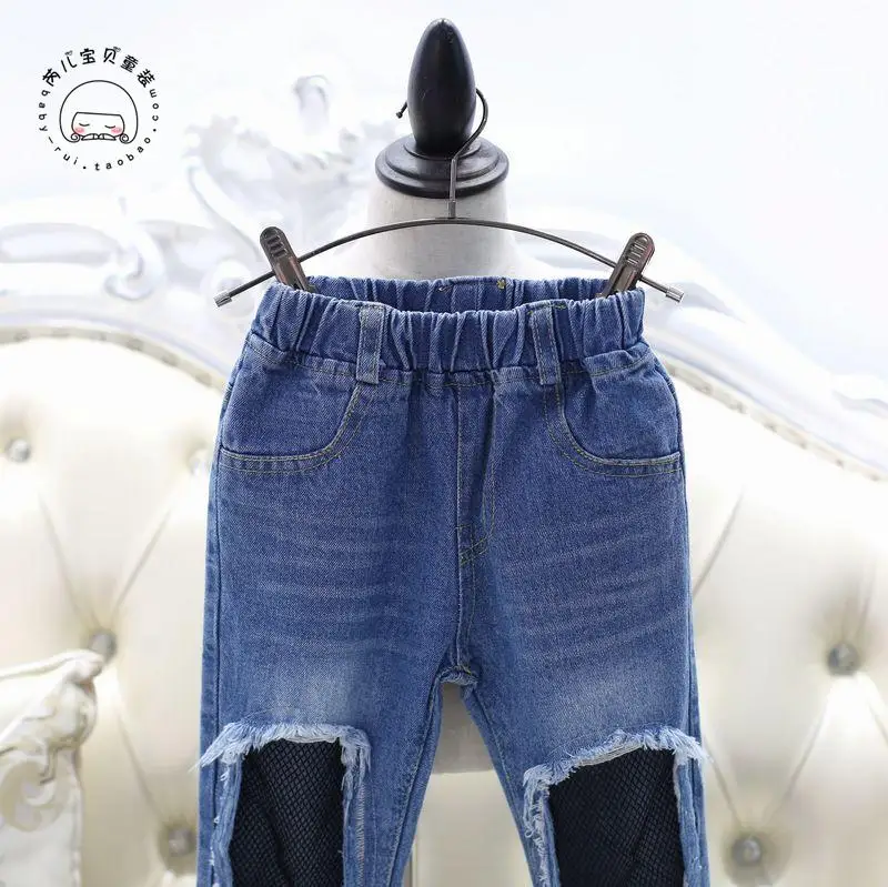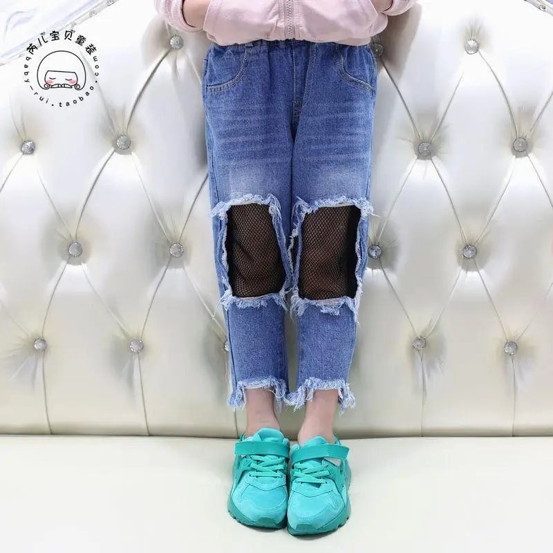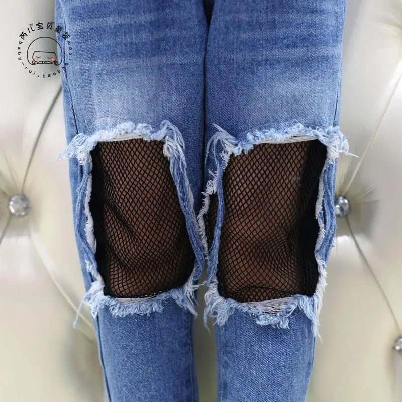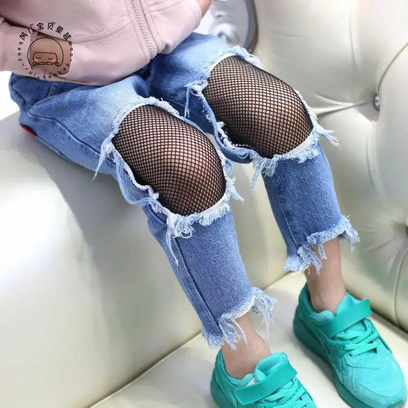 Spring Girls Jeans Hole 2017 Summer Girls Jeans Kids Pants Fashion Fishnet Design Children’s Denim Trousers Kids Dark Blue Pants