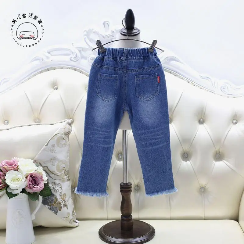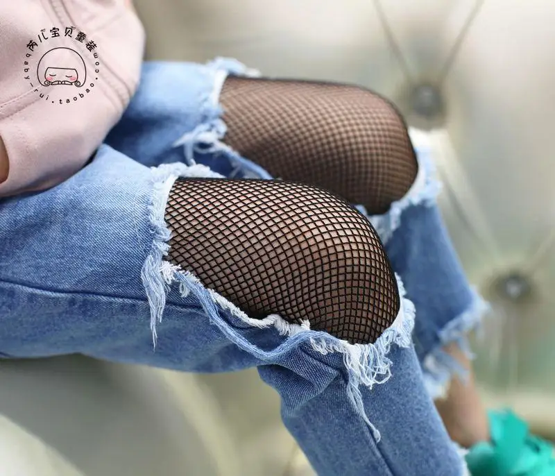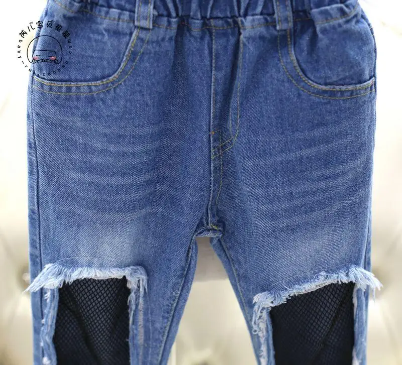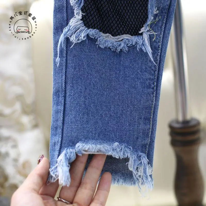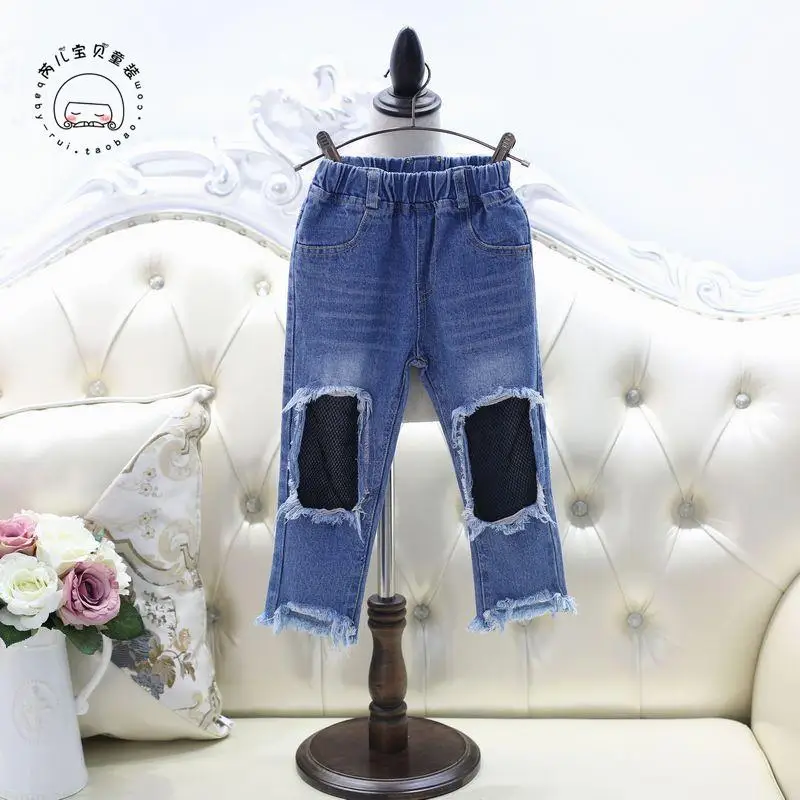 Spring Girls Jeans Hole 2017 Summer Girls Jeans Kids Pants Fashion Fishnet Design Children’s Denim Trousers Kids Dark Blue Pants