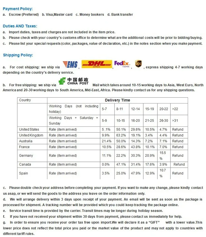 1. Dear all customers, thank you so much for visiting our store, we accept DROP SHIPPING, Hope to grow with you and be win-win partners. 2. As different computers display colors differently, the color of the actual item may vary slightly from the above images. 3. If you have any question of products or you don’t know which size to choose, please contact us with no hesitation. Payment: 1. We accept Alipay, West Union, TT. All major credit cards are accepted through secure payment processor ESCROW. 2. The price you have paid does not include any custom duty or import tax. Shipping: 1. We send parcels most of the world with Free shipping via China Post Air Mail. 2. Parcels will be sent out within 7 days after the payment verification. 3. If you didn’t receive your item in 6 weeks, please let us now, we will check it for you. 4. Russian buyers will be request right receiver’s FULL name (three parts), if not post office will return back your package, and we’ll don’t accept any refund for order without FULL name. It will take about 4-6 weeks due to strict custom.