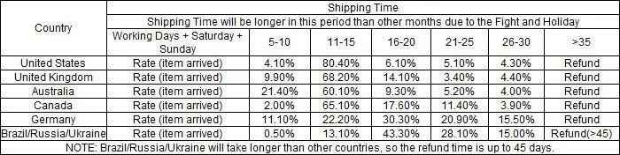 - Items will arrive in 7-25 business days to worldwide usually. And the arrival time also depends on some factors and different areas. The general arrival time table is shown below for your inference: