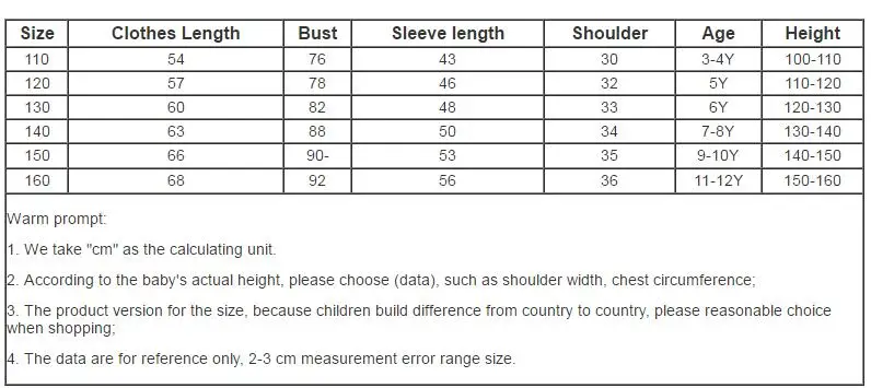 | Sizes | 110=4T 120=5T 130=6T 140=7-8T 150=9-10T 160=11T (for about 3-11T) (You can choose the size what you want) | |||