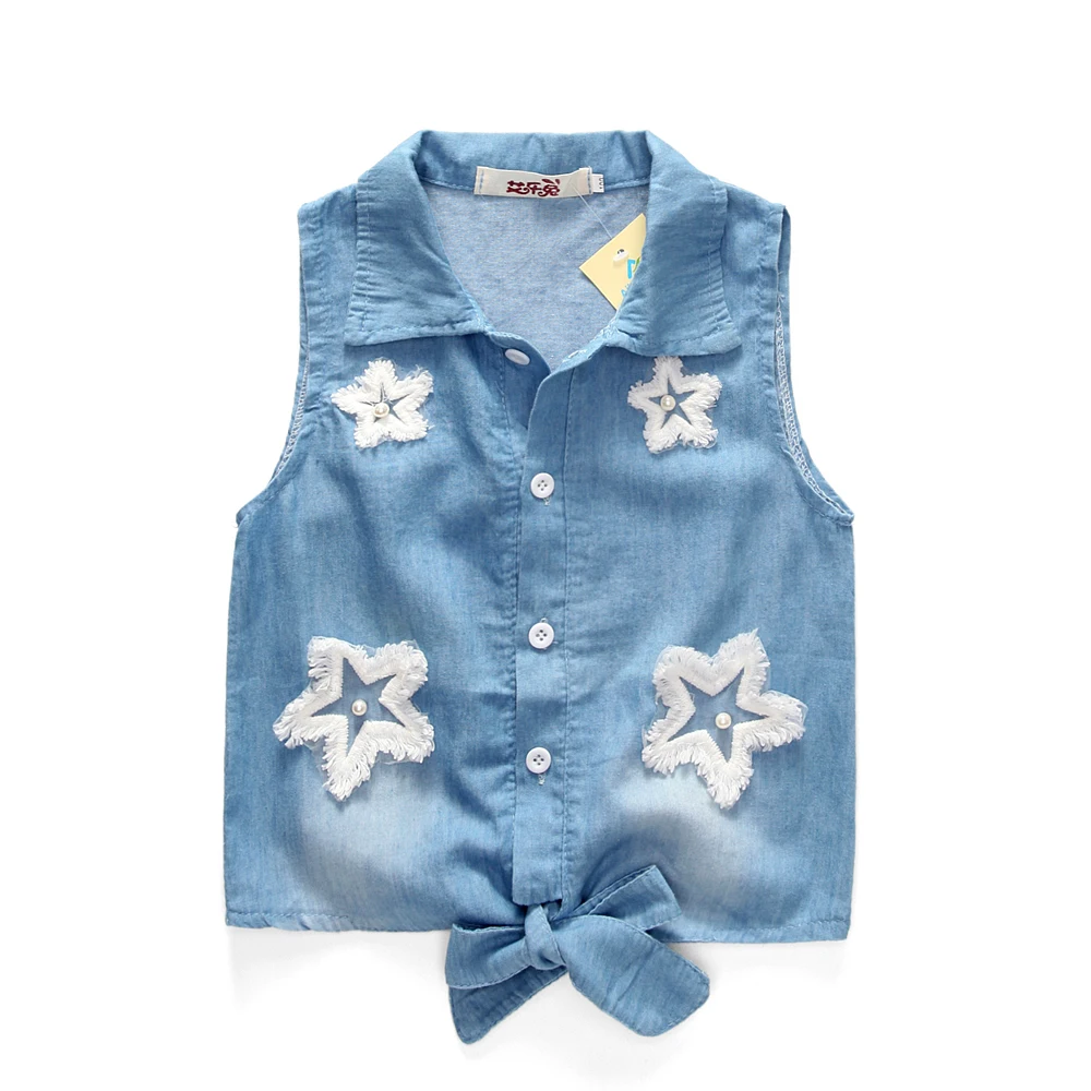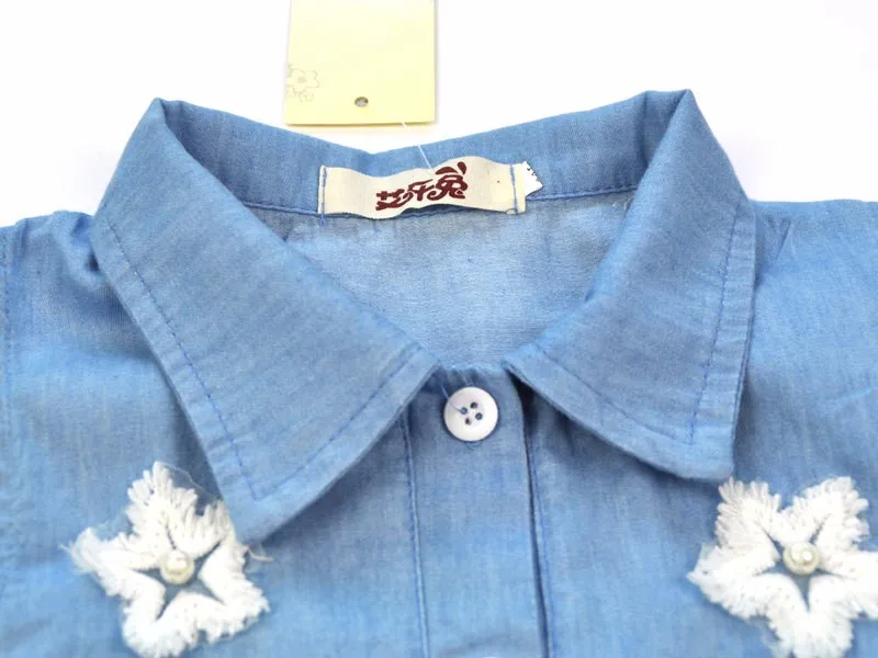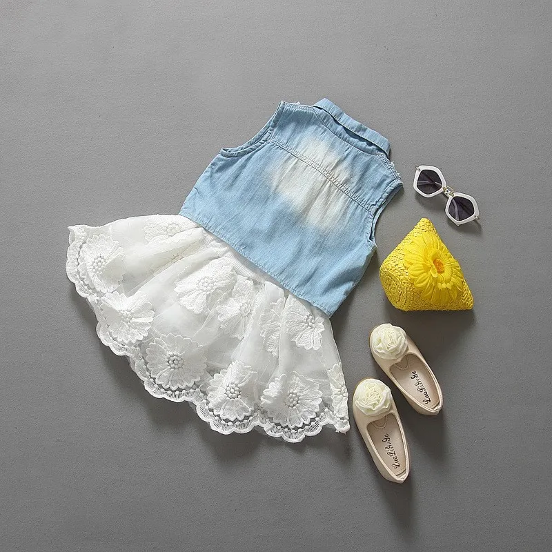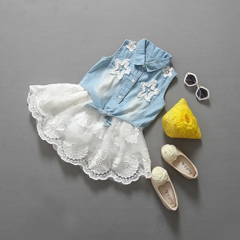 2015 Girls clothes suits lace cowboy suit jacket + skirt 2pcs / set pentacle star fashion Denim suit Kids Princess Party Set