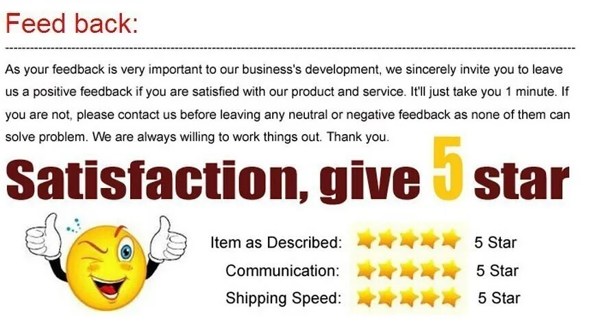 Welcome to Malayu Baby Store Http://www.aliexpress.com/store/1445056 We guarantee the value of any selected product. We care about customer value and their opinions. Therefore, the establishment of an atmosphere of trust and honesty. We look forward to establishing a successful business relationship with you. delivery time EMS (5-15 working days) China Air Mail (15-60 working days) DHL (5-8 working days on the road) Fedex (5-8 business days) 1. Ready to ship: Since we handle a lot of orders every day, we usually arrange shipment within 1-5 days. Please be patient and inconvenience you. 2. On the tax In most cases, the buyer is not required to pay any customs. We will announce it is a gift, a lower value to avoid taxes. But sometimes in some countries, customs officials may be strict. We are not responsible for any customs charges; please check your customs policy at your own place. If you have to pay customs fees, this is your responsibility to your own country; the buyer should be aware of this situation. We apologize for any inconvenience this may cause. note: 1. If you choose express delivery, please provide the correct contact phone number to avoid the local post office can not get the package with you when you arrive. 2. Sorry, we do not support the P.O.Boxes address. Please leave your correct address when placing your order. Packing Details If your order exceeds US $ 300, please contact us and we will send your package free of charge via EMS (faster than postal parcel) Large customers more concessions, more surprises New and old customers, in order to receive your package is successful, please post your full name and detailed receipt information All items will be tested before shipment. 100% quality assurance! Inventory tracking and timely delivery Thank you for your understanding, thank you. 1. If you are satisfied with our products and services, please leave your positive feedback and 5 stars. Positive (5 stars) is very important to us, please think twice before giving us feedback. 2. If you are not satisfied with our products, please feel free to contact us if you have negative (1-3 stars) feedback or a detailed rating. We will do our best to solve your problem.