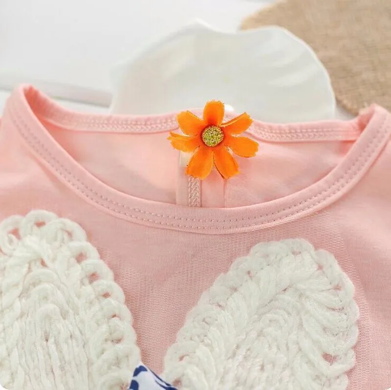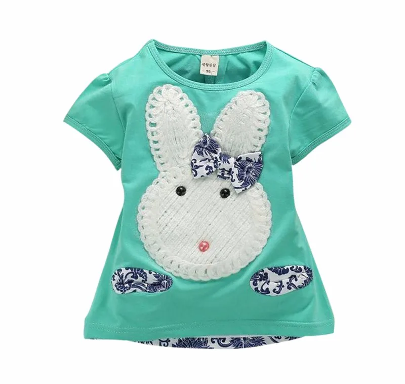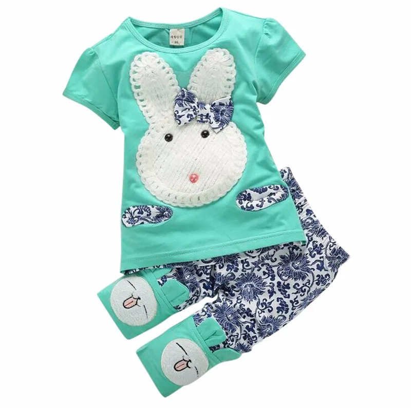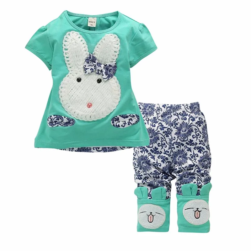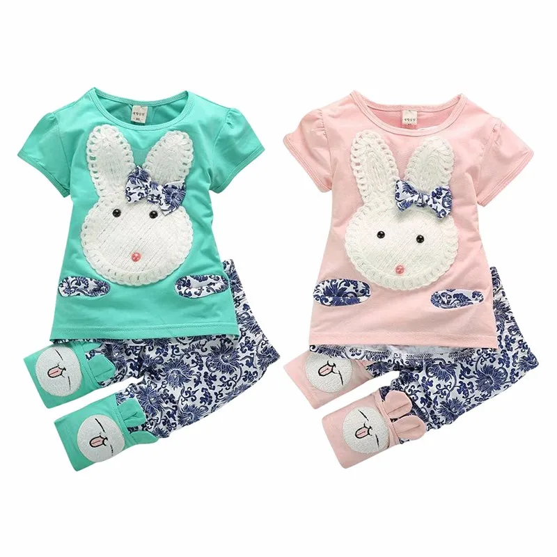 New Kids Girls Cartoon Rabbit Suit Short Sleeve Shirts Tops Sets Casual Pants Size 1-5 Y