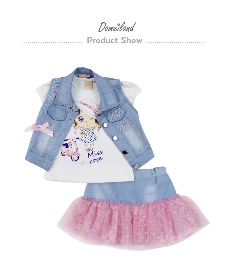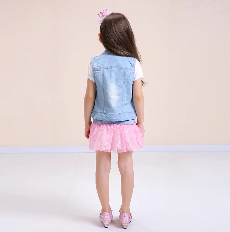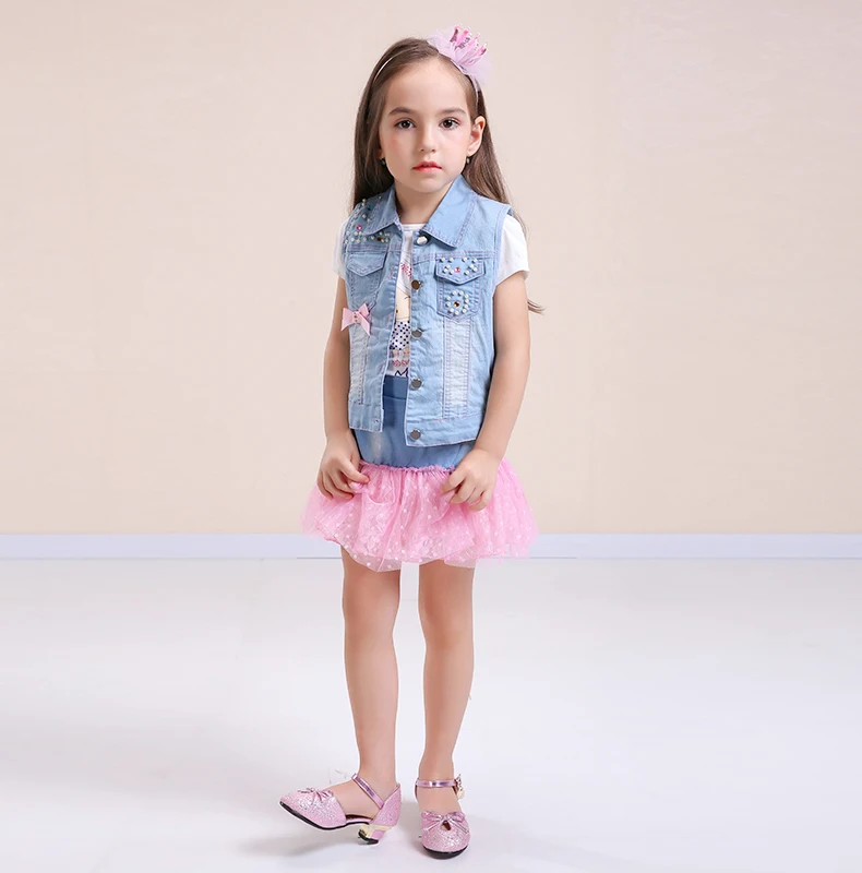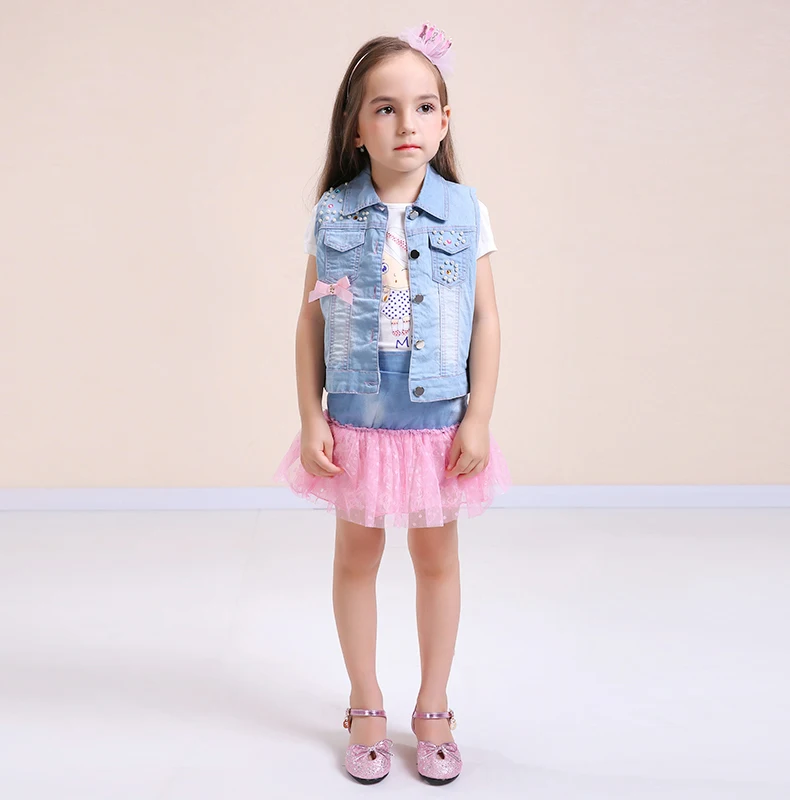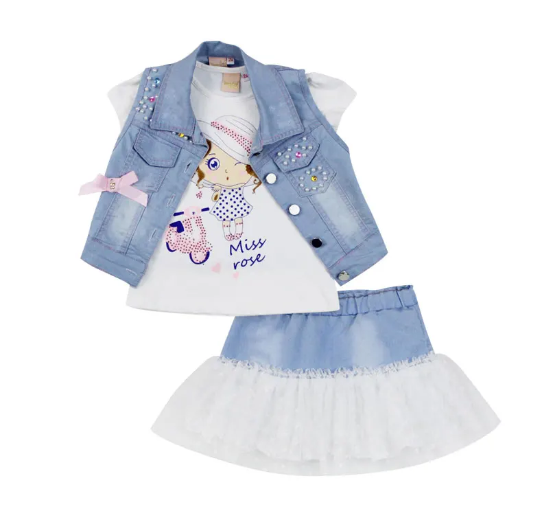 2017 fashion summer children clothing sets girl outfits Denim short vest jackets cotton kids cartoon tops skirt suits clothes