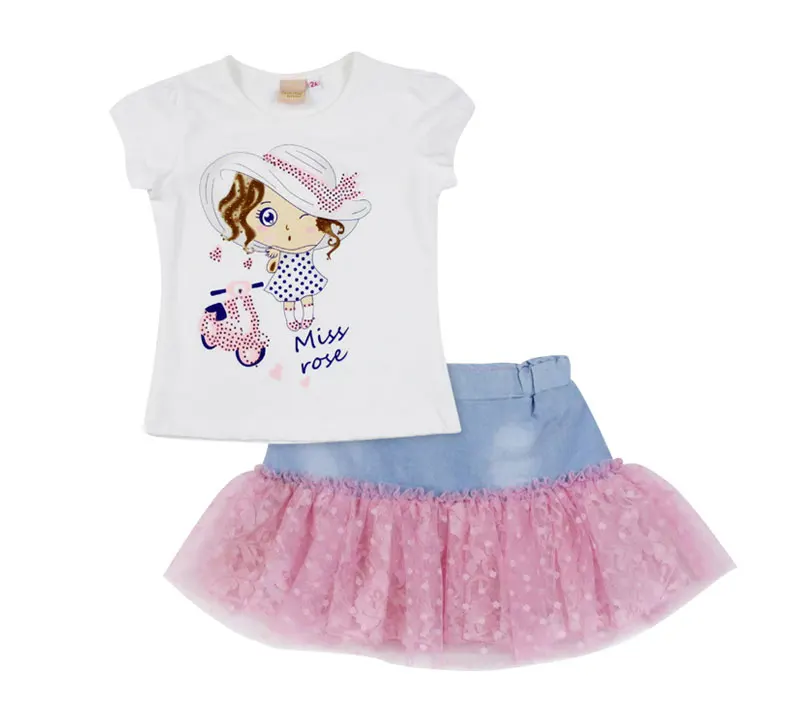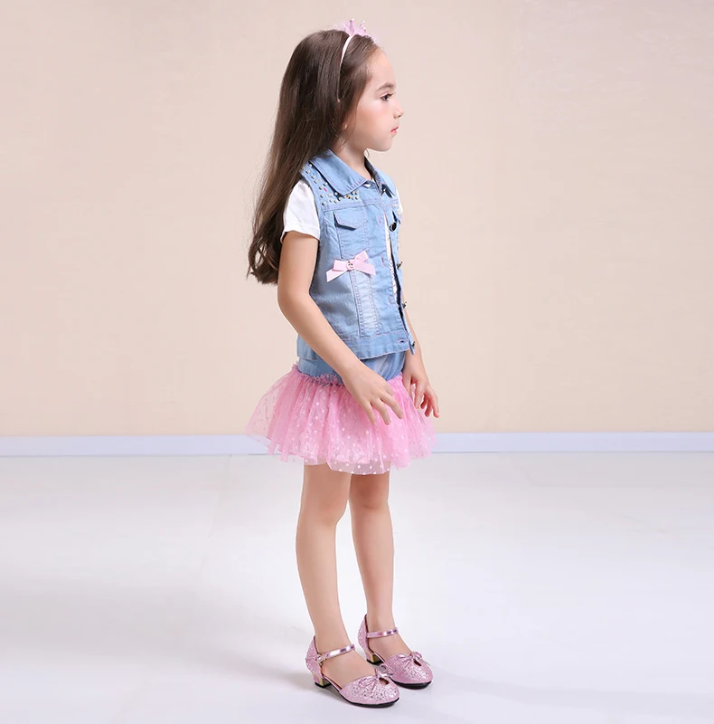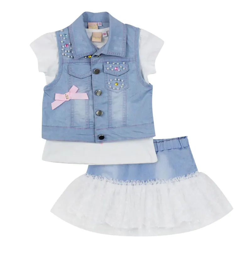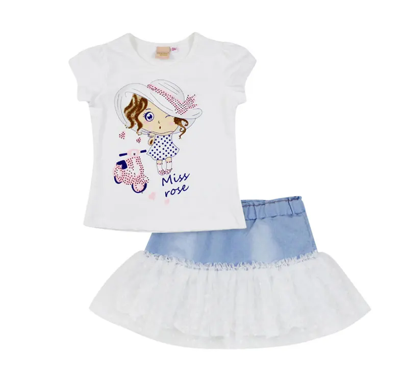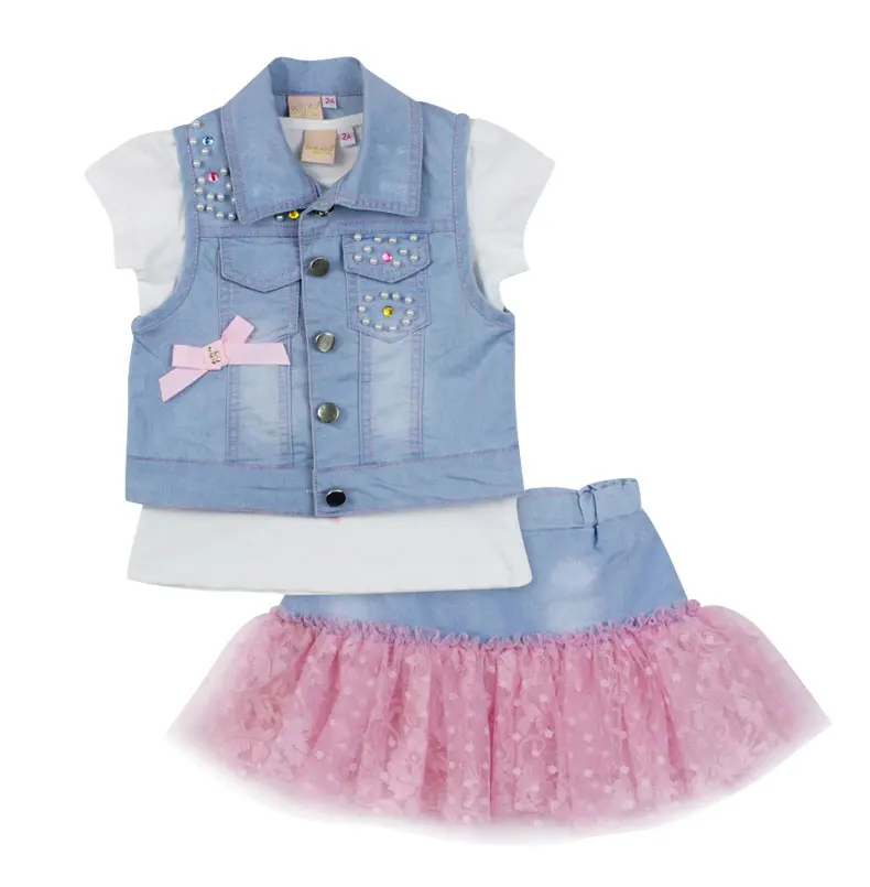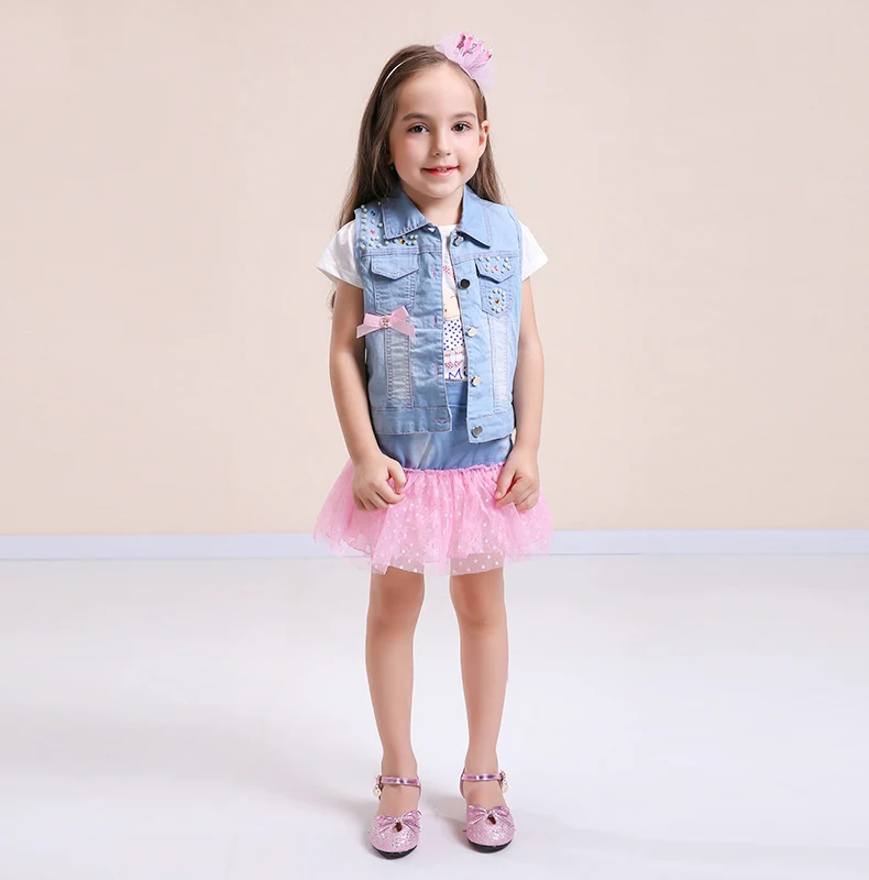 2017 fashion summer children clothing sets girl outfits Denim short vest jackets cotton kids cartoon tops skirt suits clothes