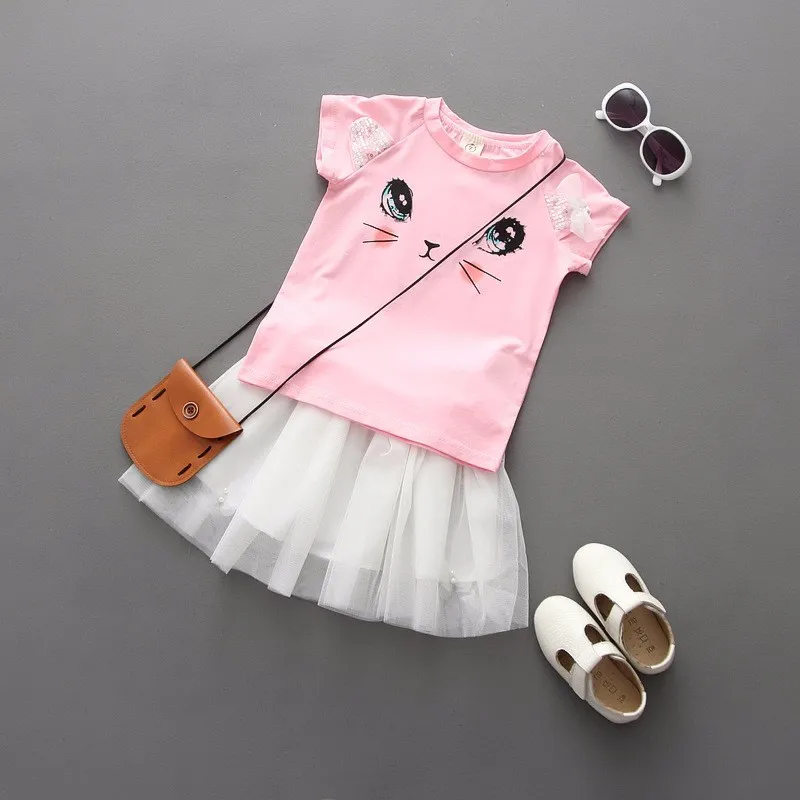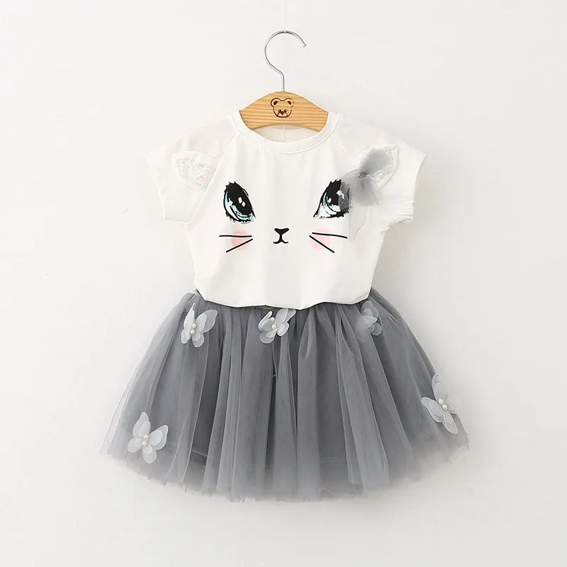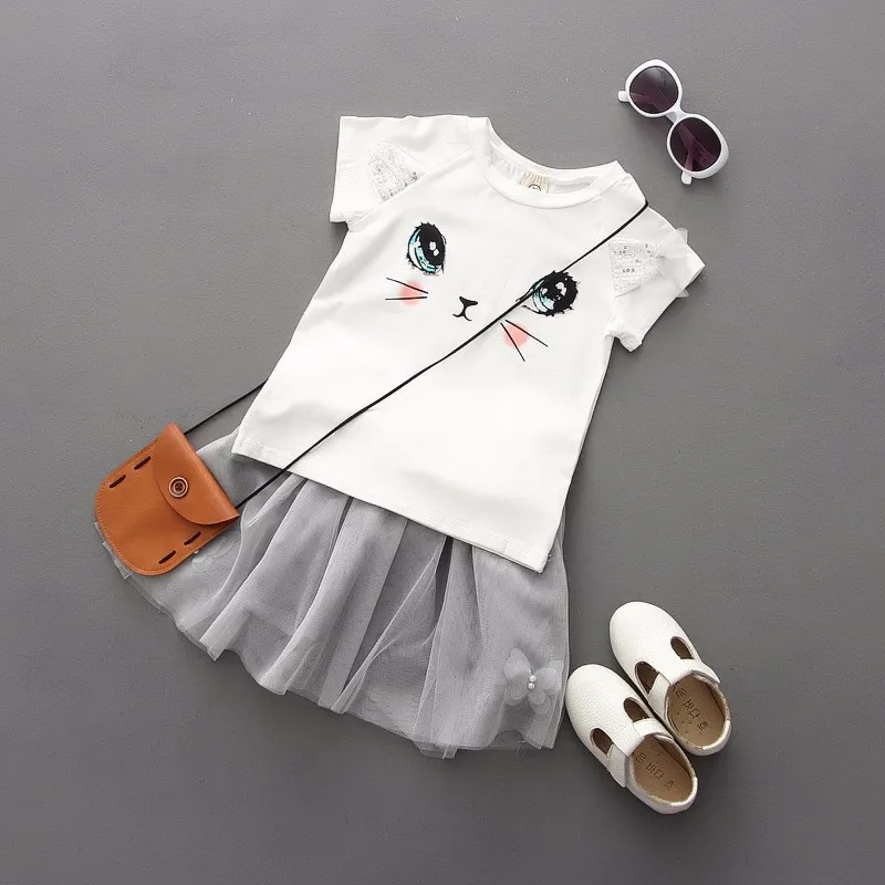 Hot Cute Summer Girls Clothing Sets Casual Cotton Short Sleeve T-shirt+yarn tutu Skirts Children Kids Girl Clothes 2pcs Set 2-7Y