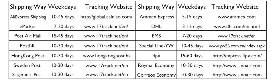 5.For some remote areas, sometimes you have to accept the delivery time with patience in around 60-90days via AliExpress Standard Shipping Method after placing the order.