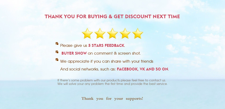 1.If you are satisfied with our products and services,please leave your postive feedback and 5 stars.