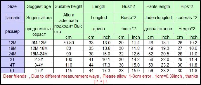 SIZE NO Suggest High Length(cm) Bust x 2(cm) 100(2-3T) 90-95cm 48 26×2 110(4T) 95-105cm 50 27×2 120(5T) 105-115cm 53 28×2 130(6) 115-120cm 54 28×2 140(7) 120-130cm 55 29×2