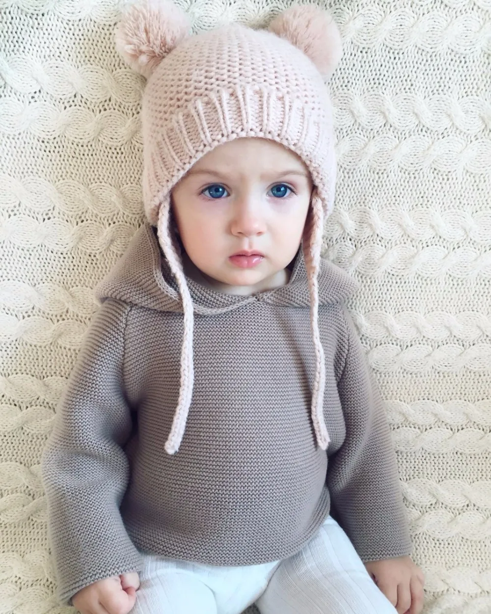 2017 spring brand new hooded knitted girl sweaters. It is all from organic cotton material. This is the fashion designer style of the latest season, good for baby boys and girls.