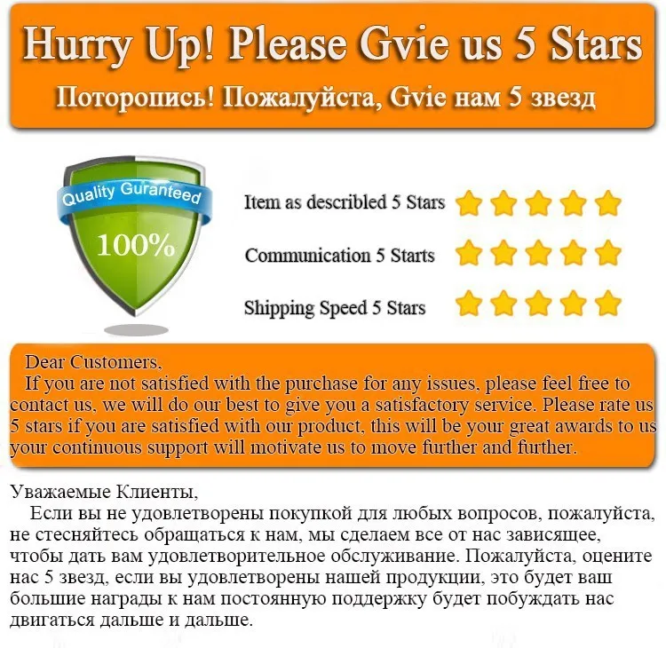 If you are satisfied with our items and our service, please leave a Postive Feedback (5 stars ) for us,it is very important for us to offer you our best service next time.
