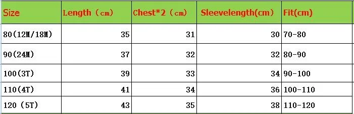 Size:80(12M/18M) 90(18/24M) 100(3T) 110(4T) 120(5T)