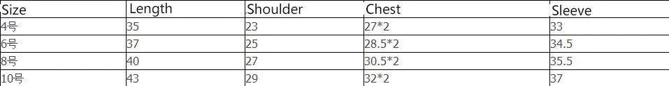 SIZE NO Suggest High Length(cm) Bust x 2(cm) 100(2-3T) 90-95cm 48 26×2 110(4T) 95-105cm 50 27×2 120(5T) 105-115cm 53 28×2 130(6) 115-120cm 54 28×2 140(7) 120-130cm 55 29×2