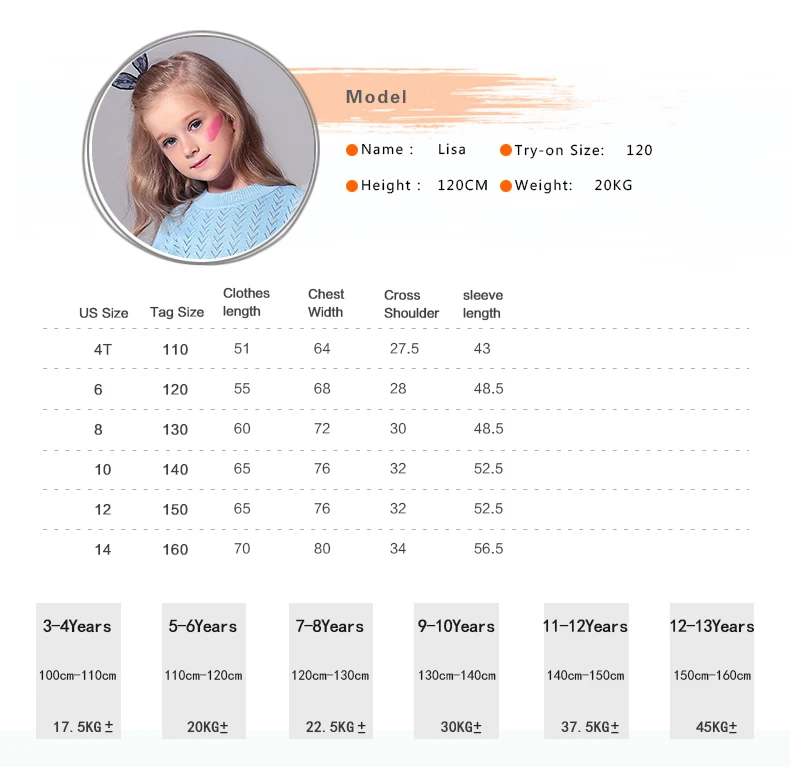 Sizes:110(4T) 120(6T) 130(8T) 140(10T) 150(12T) (for about 4T-12T) ( Before you choose the size what you want ,Hope you can read the size table carefully )