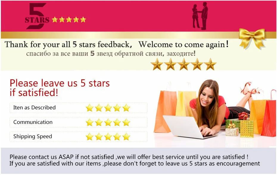 1.If you are satisfied with our products and services,please leave your postive feedback and 5 stars.