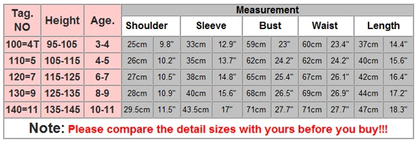 Size: There are 5 sizes (100/110/120/130/140) available for the following listing. please allow 1-2cm differs due to manual measurement, thanks (All measurement in cm and please note 1cm=0.39inch)