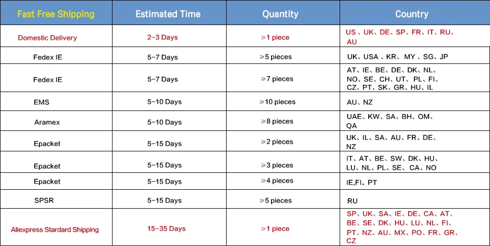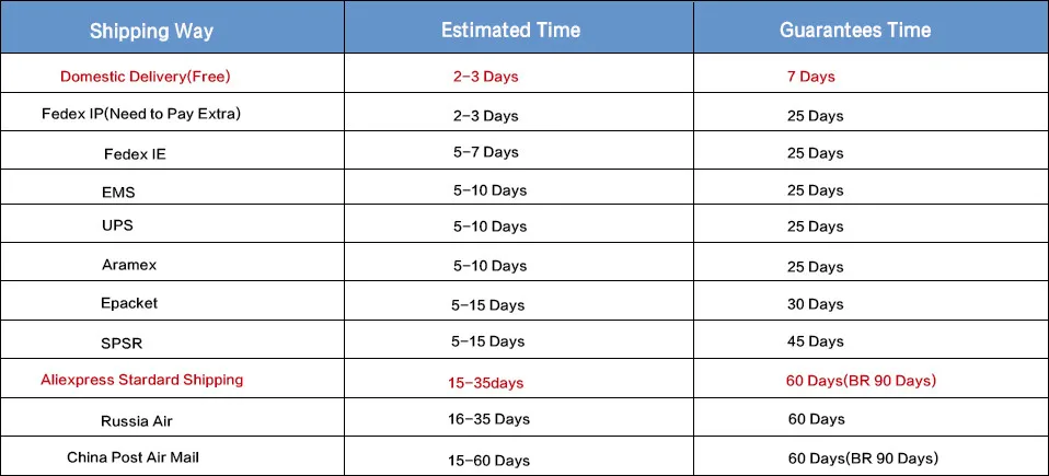Shipping Policy & Refund : 1.Estimated & Guarantees Shipping Time We usually ship within 48 hours once payment confirmed,we provide most of the country free shipping.Please refer Estimated & Guarantees Shipping Time as below. If you did not recieve the goods during our promise time,please don’t open dispute and contact with us timely.As it may meet the exceptional circumstances such as holiday,bad weather ,policy change,remote place,etc.We will help to check and would give full refund if you did not get the parcel finally. 2.Suggested Fast Shipping. China Post Air Mail is slowly,if customer choose this way,please wait patiently.For below countries,we suggest take ≥ pieces as below to get FAST FREE SHIPPING !Only supported to clothes,not including anccessories. In addtional,to US/UK/DE/SP/FR/IT/RU/AU,you could choose Domestic Delivery which will ship from your country warehouse,you only get them 2-3 days! Please Click categories .We update new hot sale weekly. 3.Your important information Please write complete address,full name(especially Russian Friends),phone number and post code so that we could ship out your goods as soon as possible.If Russian Friends did not provide full name,we could not ship out. If customer provide wrong address and require resend,need to bare resend shipping cost. 4.About Custom /Tax We are not responsible for any custom or import tax,if you take big quantity,please tell us the commercial value to avoide high tax. 5.Quality Problem & Shortage If you receive the items with quality problem or get shortage,please don’t open dispute,please take picutres and contact our customer serivce,we will give you best solution after getting the evidence provided by you. For shortage,please cotnact us right away,we will check for you if we send to you by seperate parcel and tell you another tracking number. If send shortage,we will resend to you. 6.About exchange and return If you are not satisfied the purchase,you could exchange the items.The buyers is responsible for further shipping charge and tax. a.You have 7 days to contact us and 30 days to return it from the date it was received.If this item is in your possession more than 7 days,it is considered used and WE WILL NOT ISSUE YOU A REFUND OR REPLACEMENT.There are no EXCEPTIONS! 7.About wholesale & Drop Shpping items: We support Wholesale&Drop Shipping,if you could take each size one piece,we could give you good wholesale price. For more details,please contact our sales by massage Center and tell us your easy contact information that we could contact you right away.We could send you lastest new catalogs with competitive wholesale price. Working time : We work from Monday to Saturday,if you have any question out of our working time,please leave us massange,we will reply you right away after we back to work. Or you could contact us during our working time,you could get promt reply. Beijing Time 09:00-18:30 New York Time 20:00-05:30 Melbourne Time 12:00-21:30 London Time 01:00-10:30 Have a nice shopping in our store! |