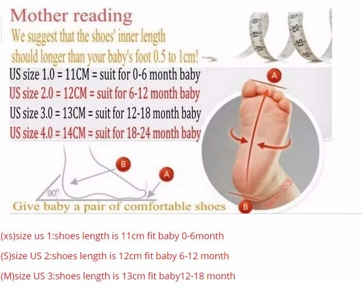 Note:the USA size is wrong please choose the size according your baby feet   length.thank you     When you place the order, just consider the detail of data of size .     There’s a deviation of 0.5-1 cm as the reason of laying relax.