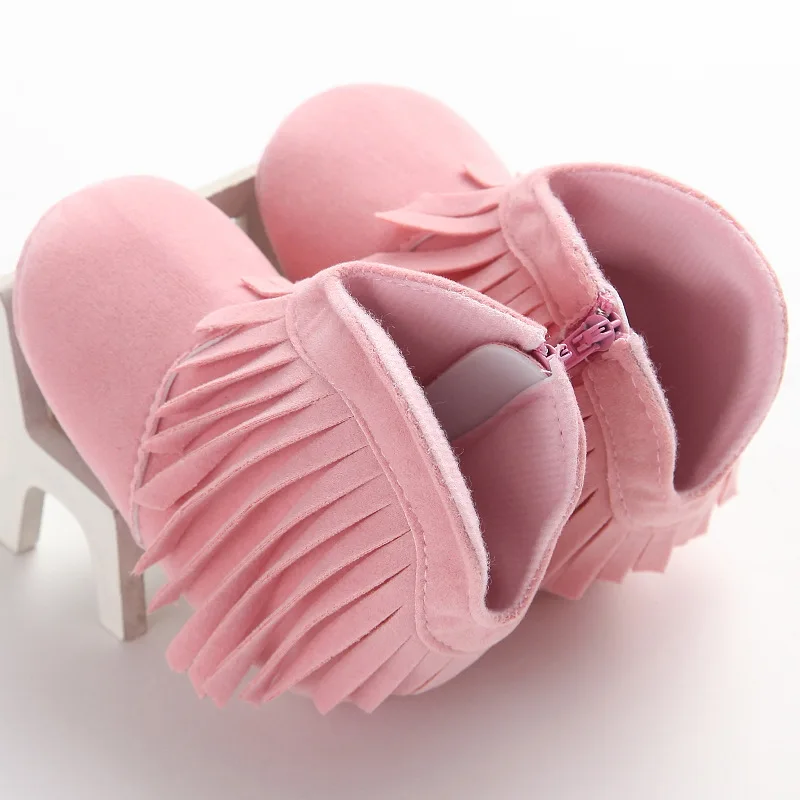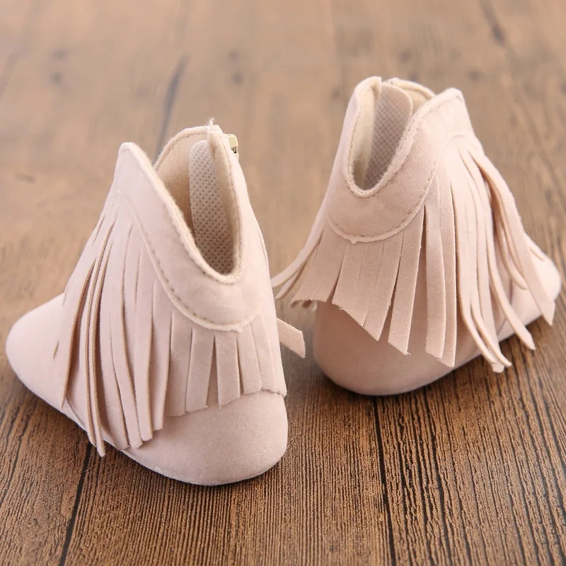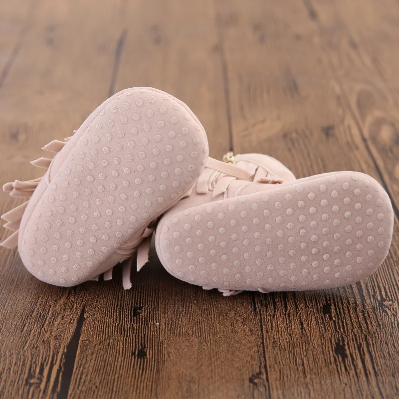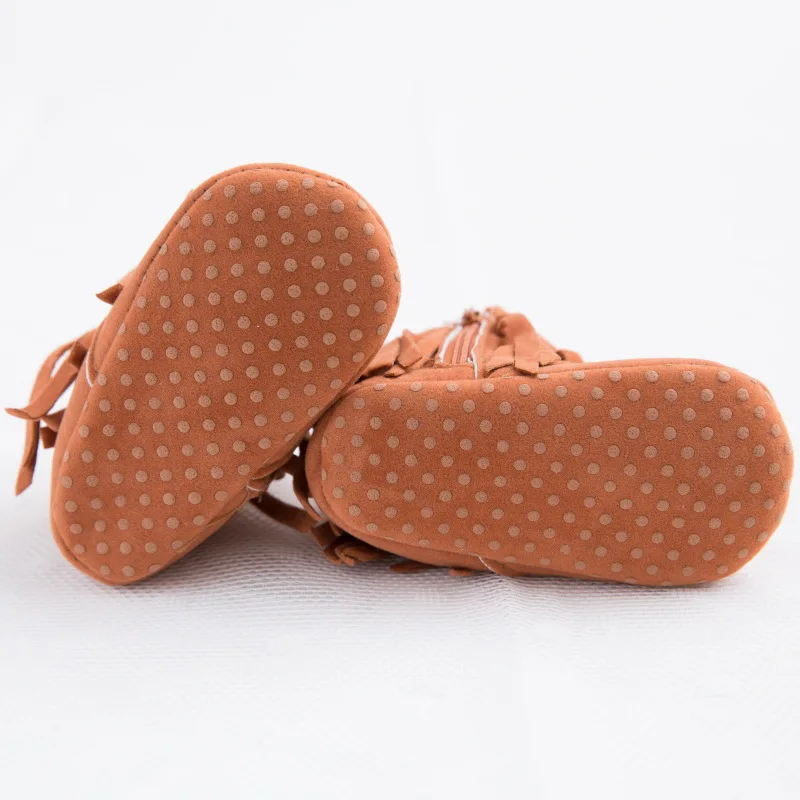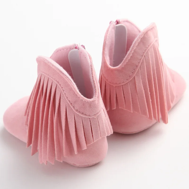 Material: Suede Leather Style: Baby Moccasins Shoes Color: Creamy-white, Red, Black, Pink, Brown, Blue Size: Fit for 0-18 months baby 1 inch= 2.54 cm please check the size reference: US 1.0= insole Length 11 CM/ 4.41” Suitable for 0-6 months baby US 2.0= insole Length 12 CM/ 4.92” Suitable for 6-12 months baby US 3.0= insole Length 13 CM/ 5.23” Suitable for 12-18 months baby We suggest that the shoes’ length should longer than your baby’s foot 0.5 to 1cm. Because of the different measurement methods, there may be 1-2cm of the allowable range error.