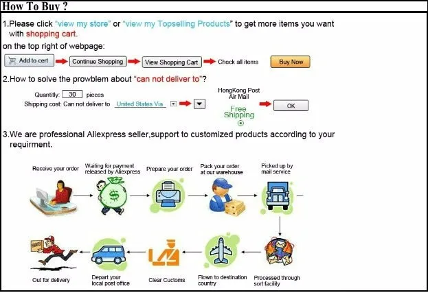 In consideration of our customers’ benefit, We have to ship your order by regular mail.Please note,Each country import need tax and paid by buyer.Different country,different tax fee. Import duties, taxes and charges are not included in the item price or shipping charges. These charges are the buyer’s responsibility. Please check with your country’s customs office to determine what these additional costs will be prior to bidding/buying. Note: If you choose free shipping option,your parcel will be directly delivered your house only one time,or it will send to your local post office.then you need take the tracking number and your personal ID to take your items. We will inform you immediately once your parcel have been sent out. Expecially Brazil post need more time to delivery the goods. FEEDBACK And Solve Problems. Dear buyers, we appreciate your business, if you are satisfied with our service, Please rate the DSR (Detailed Seller Ratings) of the transaction on Aliexpress with a “PERFECT 5 STARS” and leave us a positive feedback. Our system will automatically do the same for you. With your support by positive feedback.