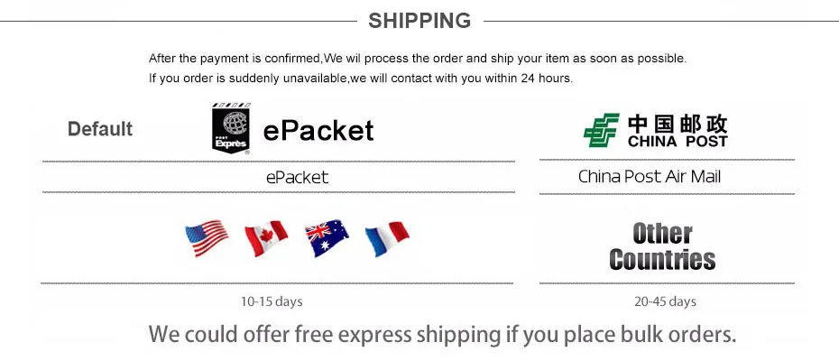 For wholesale,we will offer discount or free express shipping which only takes 3-7 days to arrive. For drop shipping,we could send the goods to your customers directly and won’t leave information about us if you’d like to. How can track my parecl? You can track your parcel on the following website using your tracking number: www.17track.net/en (Copied to the browser to open) What can I do when purchase protection time is running out? If your purchase protection time is running out, please contact us and we can help you to extend it. So your money will not go to my account. Is there any customs tax? Usually we will declare the minimum value to avoid customs tax. But due to different policies in different countries, there might be customs tax that should be paid by buyer. So you could leave a message when placing the order about how much value you would.
